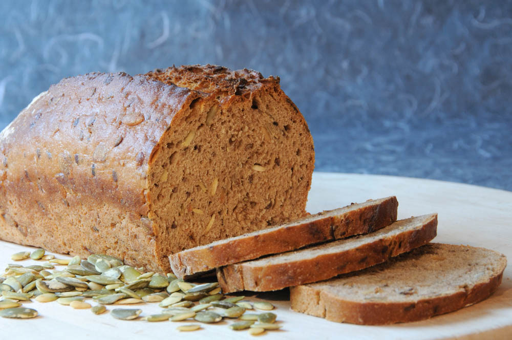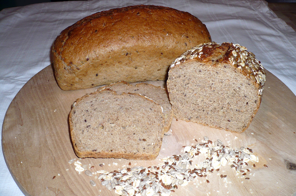Feinkörniges Vollkornbrot mit Roggen- und Weizenvollkornmehl, Sonnenblumenkernen, Leinsamen und Haferflocken.
