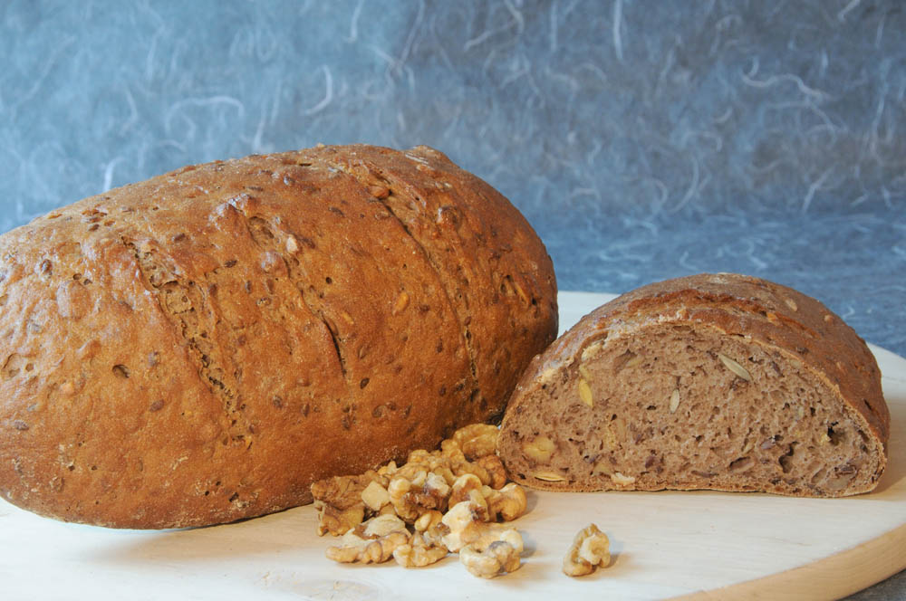 Mischbrot mit Walnüssen, Kürbiskernen, Sonnenblumenkernen und Leinsaat.